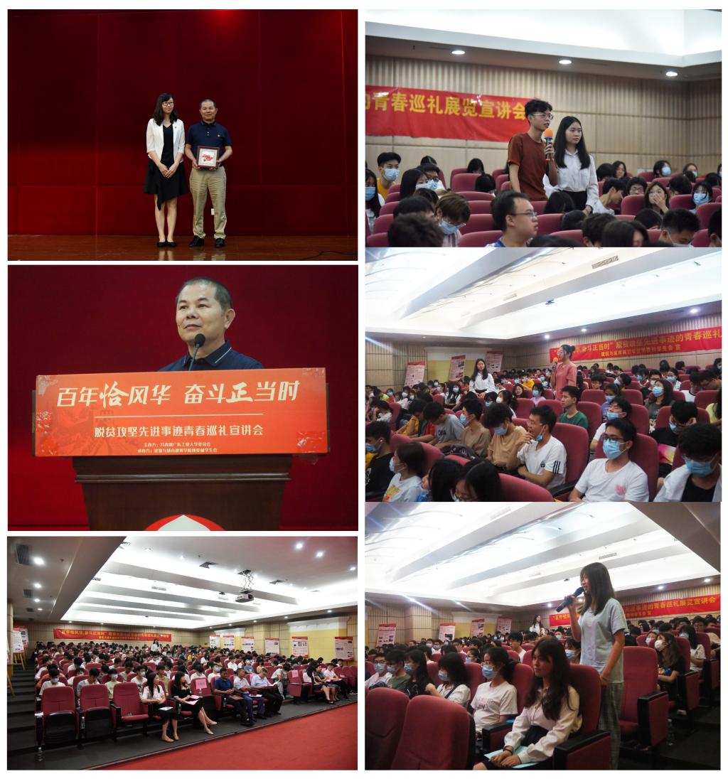 本次活动特邀全国脱贫攻坚先进个人——潮州市潮安区归湖镇狮峰村党支部书记、村委会主任李统伟作主题报告。校团委副书记王亚煦、学院党委书记钟兆明、学院党委副书记李晓伟、学院副院长何韶颖和两百余名师生参加活动。