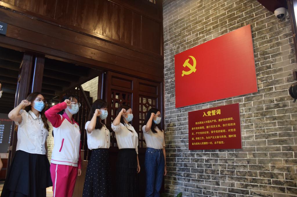微党课结束后,参加学习教育活动党员们在庄严的党旗前重温入党誓词,同学们还结合杨家祠的环境特点,开展了唱红歌和红色手绘活动。