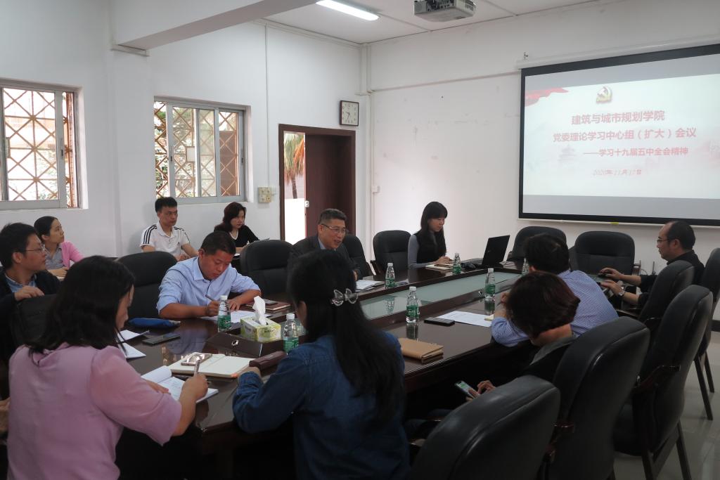 在1号楼311召开党委理论学习中心组(扩大)会议,传达学习党的十九届五中全会精神。学院党委书记钟兆明同志主持会议,学院党委委员、各教职工党支部和学生党支部书记参加了此次会议。
