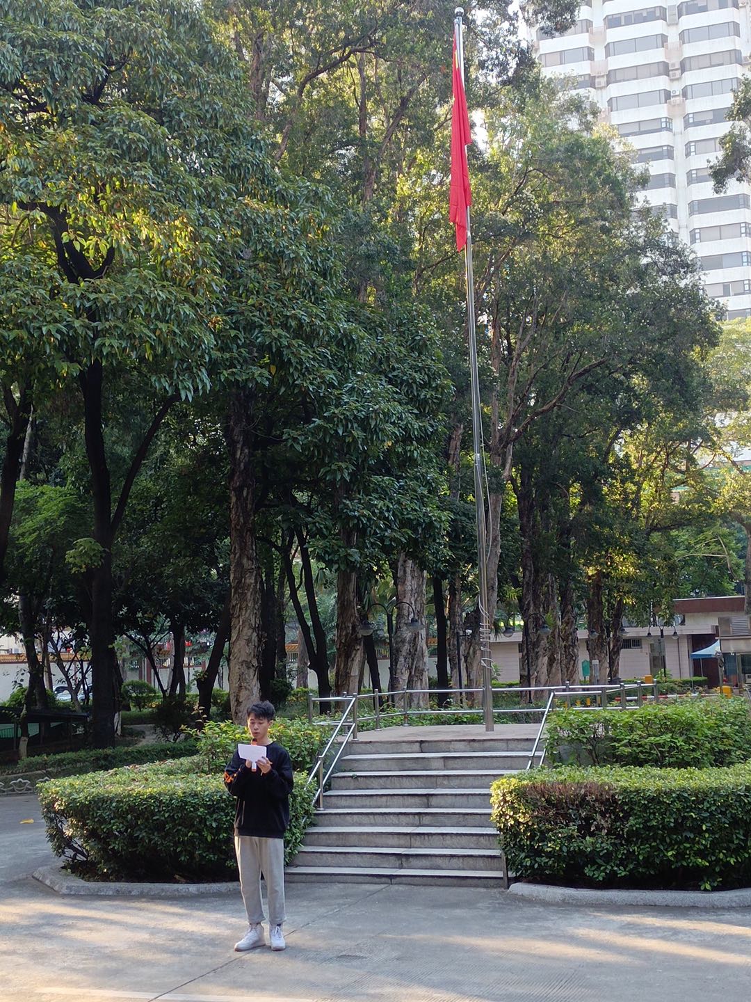鲜艳的五星红旗在嘹亮的国歌声中冉冉升起,现场全体师生怀着自豪的与激动的心情凝视着迎风飘扬的五星红旗,心中充满无限敬意。