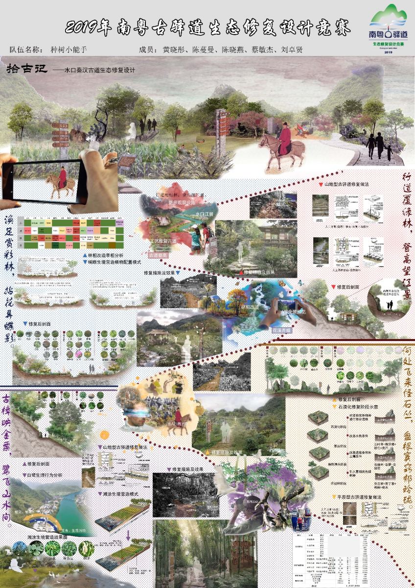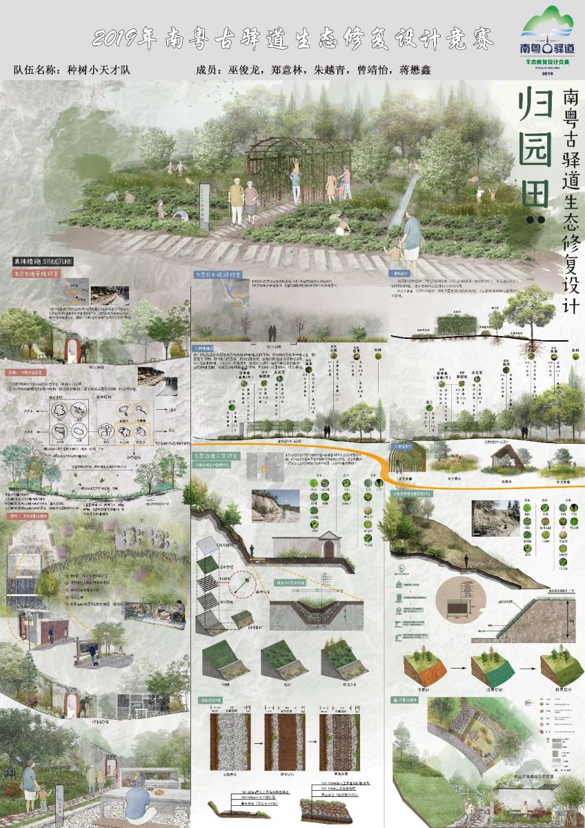 2019年11月28日,广东省 “2019南粤古驿道生态修复设计竞赛”的颁奖仪式在中国科学院华南植物园实验大楼报告厅举行。该活动由广东省自然资源厅指导,广州地理研究所、广东省生态学会、广东省土地学会、广东省“三师”专业志愿者委员会、广东省国土空间规划协会、广东省湿地保护协会、广东省土地调查规划院、广东省地质灾害防治协会联合举办,各单位代表、评审专家及参赛队伍成员约130人参加。 Spbo live score华语版 学生作品《归园田——南粤古驿道生态修复设计》(指导老师:肖希老师,学生:巫俊龙、郑意林、朱越青、曾靖怡、蒋懋鑫),荣获大赛唯一的一等奖。《拾古记——南粤古驿道生态修复设计》(指导老师:陆剑,学生:黄晓彤、陈蔓曼、陈晓燕、蔡敏杰、刘卓贤),荣获二等奖。 本次竞赛活动从前期筹备调研到颁奖历时半年,分为高校组和专业组,赛程包括海选、现场调研、竞赛答辩、最终作品提交以及颁奖等主要阶段。参赛队伍针对从化钱岗古道,南雄梅关古道,河源粤赣古道(和平段),清远英德古驿道、阳山古道等5条南粤古驿道重点线路开展了生态修复设计竞赛,设计作品展示了扎实的设计功底、卓绝的设计能力和独到的设计视角。竞赛队伍是从25支高校组队伍、16支专业组通过海选的方式由专家评审产生的。正式参赛的高校组和专业组队伍通过两轮竞赛和网络投票的形式各竞赛出一等奖1支、二等奖2支、三等奖3支、优秀奖(高校组5 支,专业组4 支)。 《归园田——南粤古驿道生态修复设计》图纸 《拾古记——南粤古驿道生态修复设计》图纸