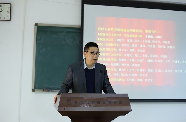会上,钟兆明书记传达了学校春季新学期工作会议上陈新书记的讲话精神。2018年,学校在从严治党、学科建设、学生培养、科技创新、人才引进、国际合作、综合治理等方面都取得了显著的成绩。对于学院来说,2018年的工作亮点纷呈:组织师生学习党的十九大精神和习近平总书记视察广东重要讲话精神,学院领导班子顺利换届,建筑学专业顺利通过复评,学院主办的2018年中国城市更新研讨会圆满举行,校庆60周年庆典活动顺利举办,连续两年获得学校“十佳书记项目”,师资队伍建设再上台阶,成功获得自然科学基金项目1项,顺利召开学院第三次团员暨学生代表大会,学生创新创业高水平竞赛喜获佳绩,这些成绩的取得是全院师生共同努力的结果。