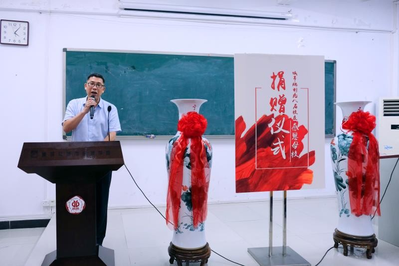 随后,98届校友代表向学校捐赠一对“不忘初心 宁静致远”的花瓶。不忘初心,意为对母校,对恩师浓浓的母校情,师生情,象荷花一样洁白无瑕。宁静致远,意为又一次回到母校,回到家,好比这对美丽的花瓶,老师其实就是大师,花瓶的制作就好比学生的成长过程,传统,传承,老师与学生,土与火,在静谧中升华,象荷花一样灿烂。