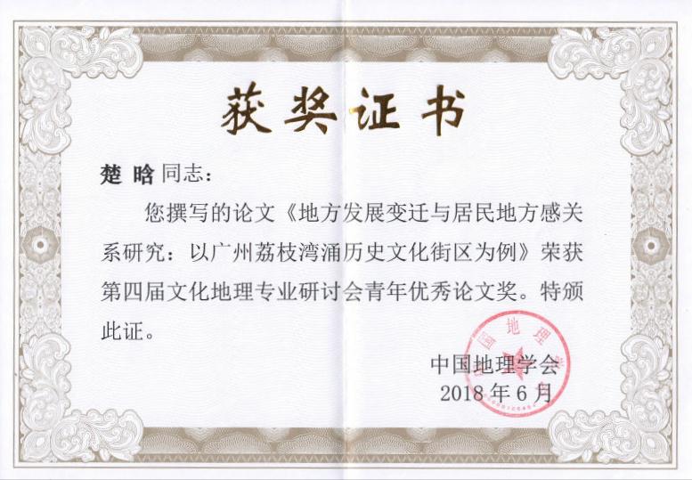 谢涤湘教授指导的2017级研究生楚晗同学所撰写的论文《地方发展变迁与居民地方感关系研究:以广州荔枝湾涌历史文化街区为例》在会议上喜获青年优秀论文奖。此次10位获奖者,主要为来自全国各高校的青年教师和博士生,Spbo live score华语版