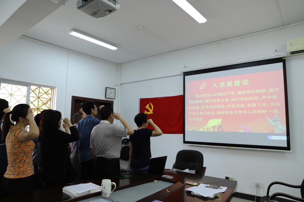 会前,支部全体党员面向党旗,在支部书记的领誓下,高举右拳进行庄重宣誓,各位党员重温入党誓词,再次坚定入党之初的信念,明确许下作为一名共产党员的责任与义务,不忘初心,砥砺奋进的诺言。