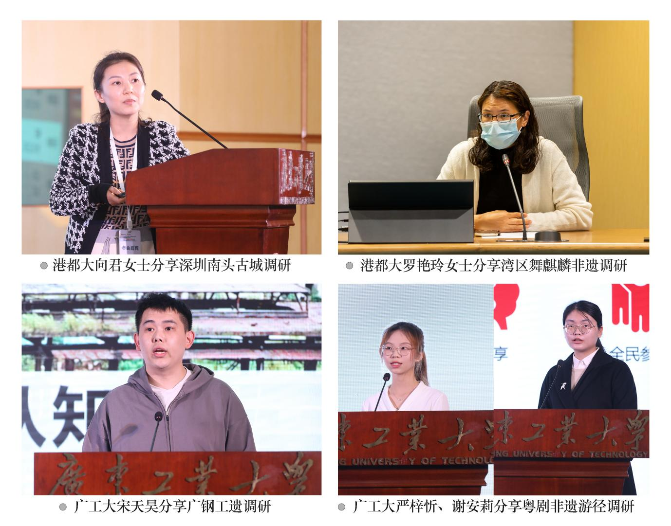 调研成果交流会环节中,香港都会大学2020级学生向君以深圳南头古城为例研究了历史文化遗产活化中的社区参与。2020级学生罗艳玲女士以香港客家麒麟为例研究了麒麟的历史与近现代由麒麟文化繁衍的舞蹈等,通过列举粤港各地同有的舞麒麟风俗阐述了大湾区紧密的联系。广东工业大学2020级研究生宋天昊及2018级城乡规划本科专业五位同学以广钢为例研分析工业遗产活化的价值内涵及公众的认知。广东工业大学2019级城乡规划本科专业严梓忻、谢安莉分享了对粤剧传承的青年友好化探索,展示出对粤剧在大湾区跨龄代、跨地域传承的思考。