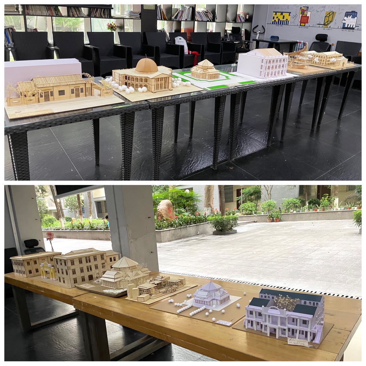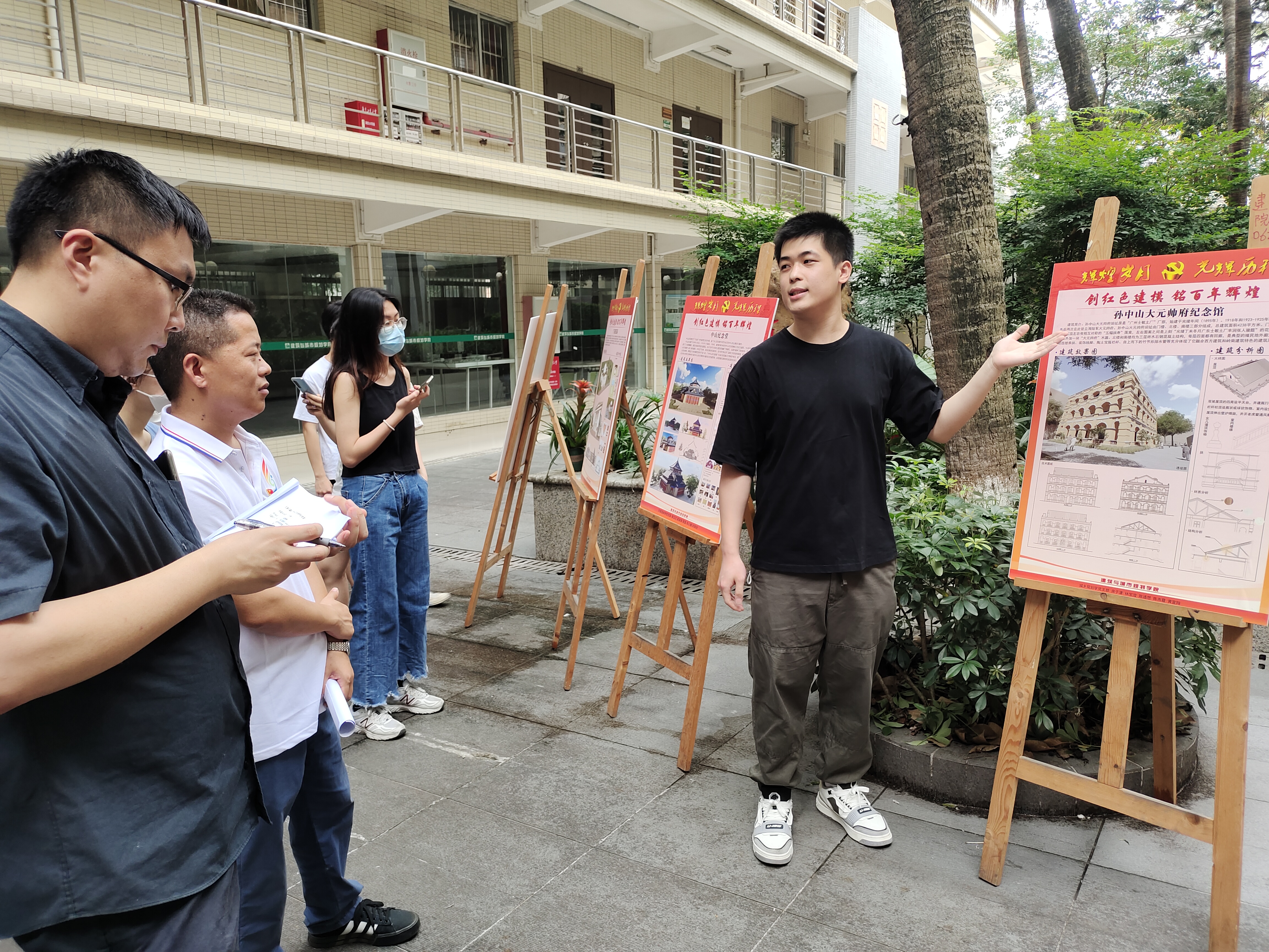 5月26日中午,学院对5个学生党支部创作的12个模型作品进行现场评审。学院党委副书记李晓伟,建筑系系主任刘旭红教授、黄健文副教授、林瀚坤老师,辅导员刘悦、贾朝强、张梦迪、余娟担任评委。每个创作小组的负责人对红色建筑背后的党史故事、蕴含的文化精神价值、设计理念和模型的制作过程进行了讲解。在交流环节,评委们以中山纪念堂为例,请同学们思考如何运用现代的建筑设计理念和手段,去重新设计中山纪念堂来纪念孙中山革命的一生、体现他“天下为公”的革命理想。同学们大胆设想,就如何提升中山纪念堂的采光、通风、舒适性和实用性进行了火花的碰撞。