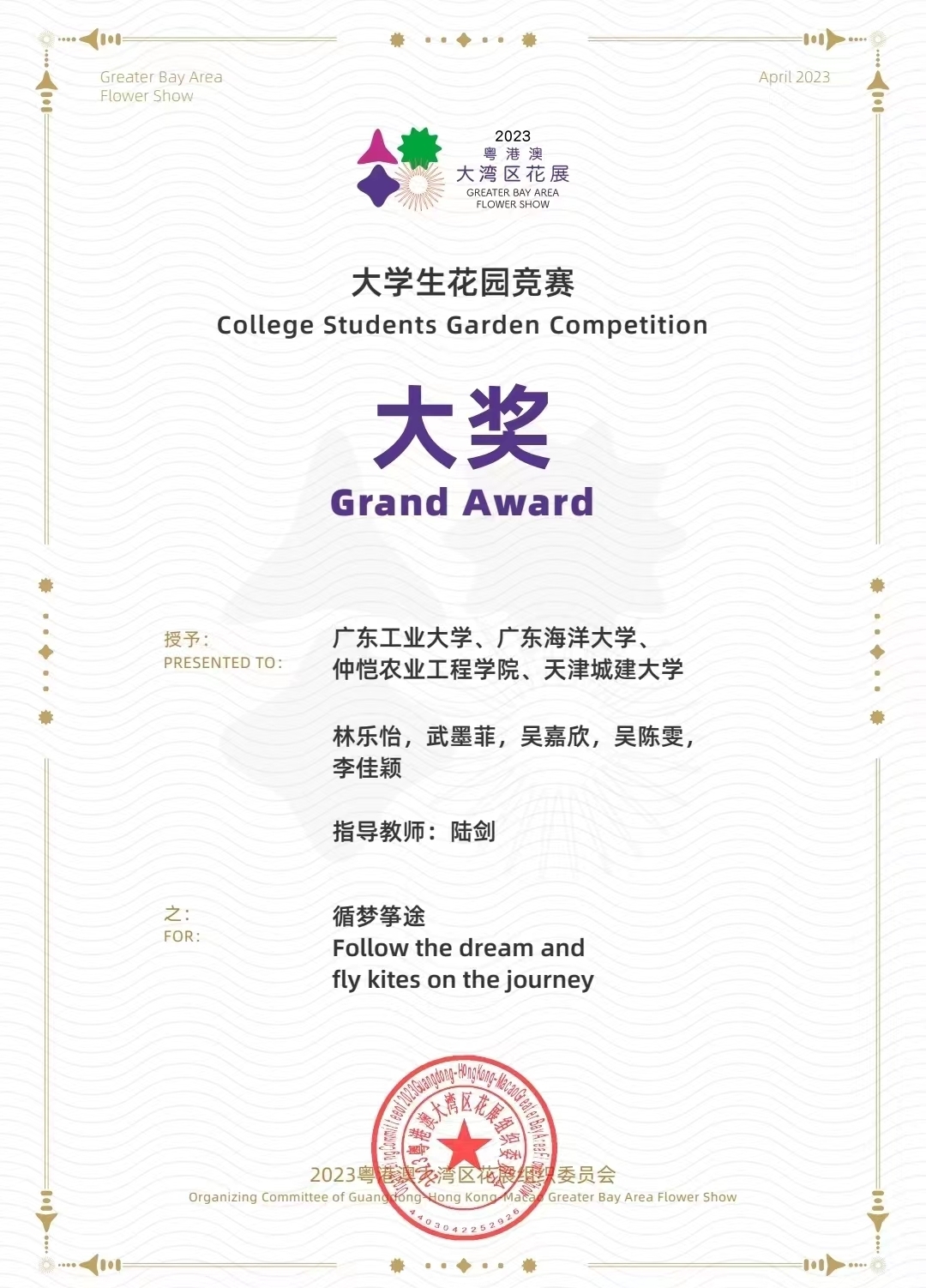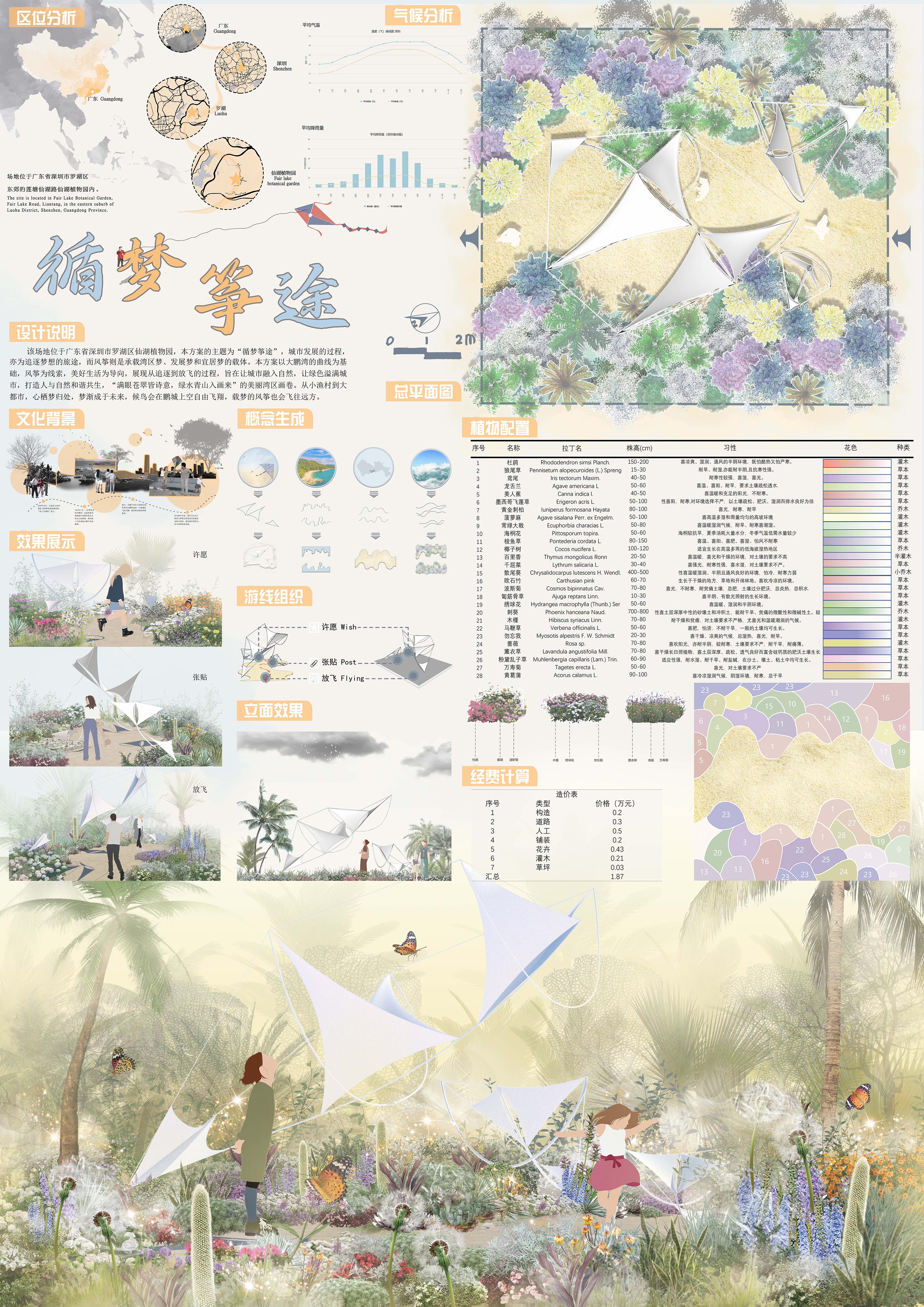 风景园林系陆剑老师带领来自广东工业大学、广东海洋大学、仲恺农业工程学院和天津城建大学等4所大学的5名本科生设计的花境《循梦筝途》在百余份作品中突围而出进入决赛的答辩环节,并得到与会专家的肯定,收获大奖。获奖作品的简介如下。