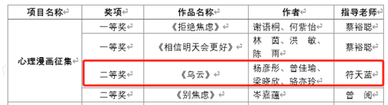 2022级城乡规划(国土空间规划创新班)班主任符天蓝老师指导学生创作的作品《乌云》在“妙笔绘初心”心理漫画征集活动中荣获二等奖,祝贺获奖师生!