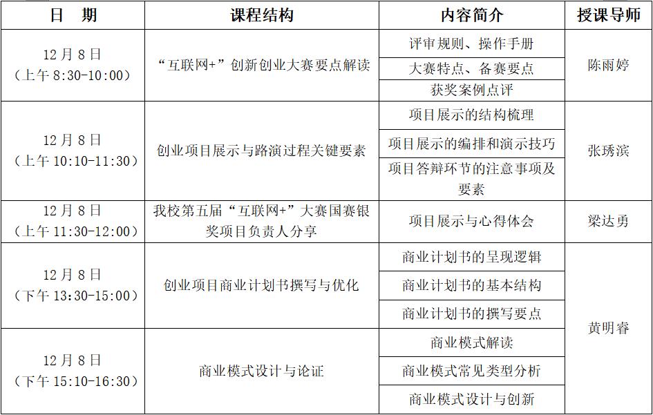 为了更好地备战第五届“工创杯”创业实践挑战赛暨第六届“互联网+”创新创业大赛选拔赛,加强项目实战指导与管理,学生就业指导中心拟定于12月8日开展第十一期大学生创新创业训练营(以下简称“训练营”)活动,旨在通过专家面授的方式,帮助学生了解赛事规则和撰写创业计划书等,从而为优化创新创业项目奠定坚实基础。现将相关事项通知如下: