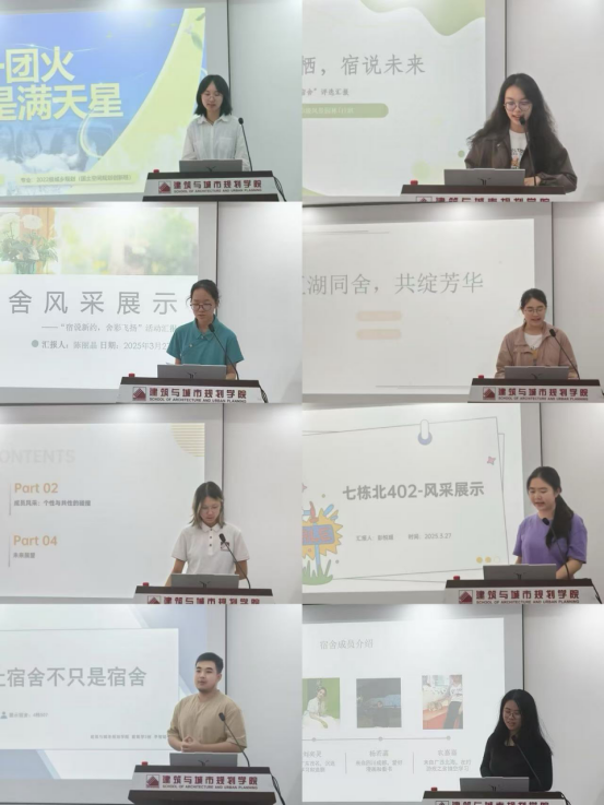 活动开始,8个宿舍代表依次上台进行风采展示。“宿舍规则怪谈”的7栋北905宿舍、“星火计划”的旧1栋211宿舍、“制度有温度,个性有边界”特色公约的7栋北402、五位一体理念公约的7栋北801宿舍、包揽班级前五的学霸7栋北807宿舍、“美食担当、美学魔法师”等活力四射的7栋北903宿舍等都纷纷展现出凝聚力强、文化氛围好的宿舍特性。同学们的团结协作精神在这一过程中得到了充分的体现,他们共同策划、分工合作,将宿舍打造成了一个个温馨而富有个性的小天地。